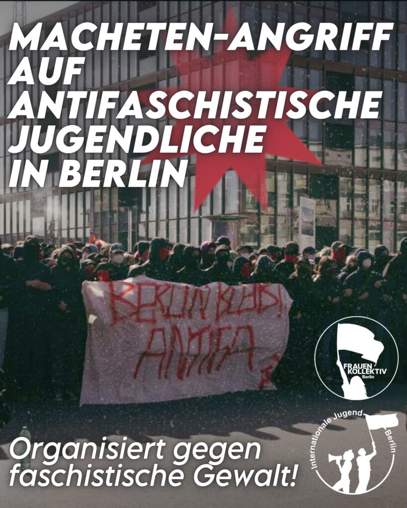 In der Nacht vom 24. auf den 25.03. wurde eine Genossin der Internationalen Jugend Berlin zusammen mit einer Freund:in auf ihrem Heimweg von Faschisten in Friedrichshain angegriffen. Die beiden Angreifer kamen vermutlich aus einer bekannten Fascho-Kneipe. Zuerst pöbelten sie rum, dann nahmen sie die Machete raus und schlugen der Freund:in mit der flachen Seite ins Gesicht. Anschließend schlugen sie unserer Genossin, die an die Wand gedrängt wurde, mit der scharfen Seite der Machete auf den Kopf. Als sie noch einmal ausholten und mit der Machete auf den Kopf der Genossin zielten, riss sie ihre Arme hoch und erhielt dadurch einen Schnitt über die Unterarme. Danach konnte sie schließlich wegrennen, dabei riefen ihr die Faschos “Scheiß Punker” und dreimal “Sieg, Heil” hinterher. Aus einer linken Kneipe kamen Leute zu Hilfe und die Faschisten suchten das Weite. Die Verletzungen konnten alle im Krankenhaus versorgt werden. Der Schnitt am Unterarm ging bis in den Knochen.